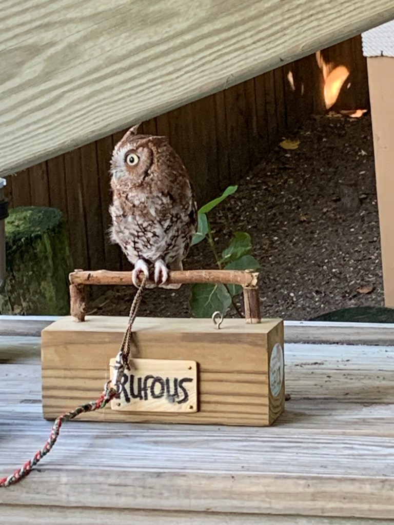And then there was my favorite: Rufous. I can’t tell you how much I wanted to pet this little guy. The volunteer who was handling him was a walking encyclopedia. I’m pretty sure there wasn’t a question you could ask that he couldn’t answer. I learned that Rufous is an Eastern Screech Owl. Unlike birds, raptors like Rufous are carnivorous. They eat cockroaches. I think he’d be very happy on my back porch.