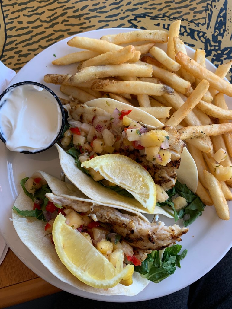 I ordered the fish tacos. The menu said they included lettuce, pineapple, salsa and lime cream ($15). They were amazingly bland. I wasn’t sure how you could make pineapple tasteless so I picked out a piece and sampled it. No, no flavor.