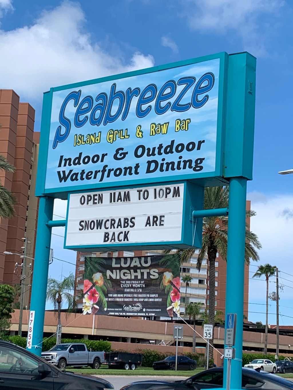 Seabreeze Island Grill is located at 17855 Gulf Blvd. Their number is 727-498-8688. They’re open 7 days a week from 11:00 am – 10:00 pm. The menu is online at http://www.seabreezeislandgrill.com.