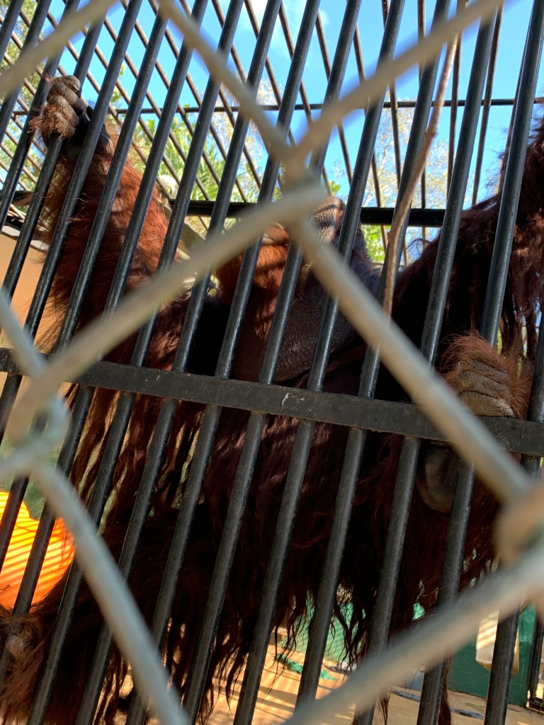 And then there’s the orangutan, Pongo. As he hung from the top of the bars, I watched him position his feet on either side of a huge barrel and then roll it from side to side as he simultaneously pushed it forward, maneuvering himself around the perimeter of the cage. I thought it was his way of having fun but was told he hated getting his feet wet and when they’d hosed down the floor of his cage, that’s how he avoided the water. Clever boy.