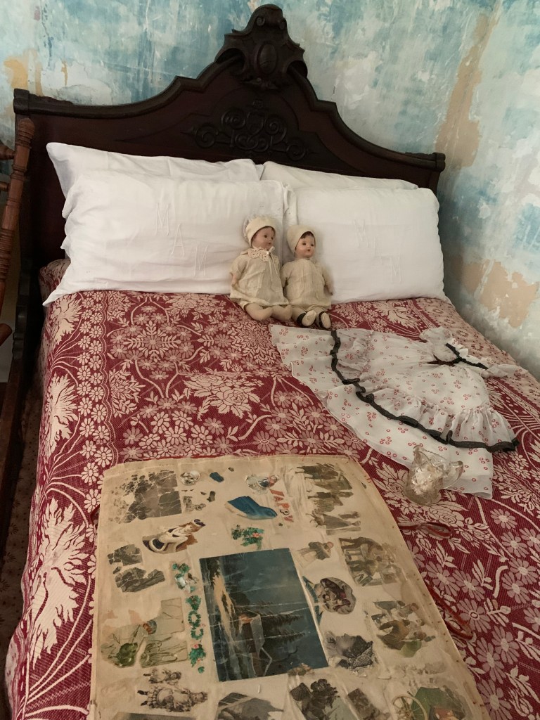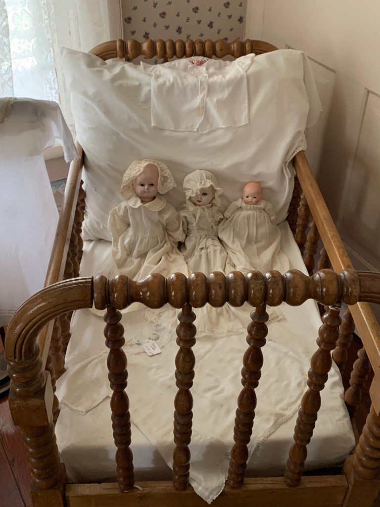 I’m not sure if you can tell from my photo that the bed in the master bedroom seems a tad small. As it turns out, the average male in the 1860s was 5’7″. The bed in the center photo was for the older children and if there were two or three, they shared. The crib on the right contains three dolls, original to the era, made of porcelain.