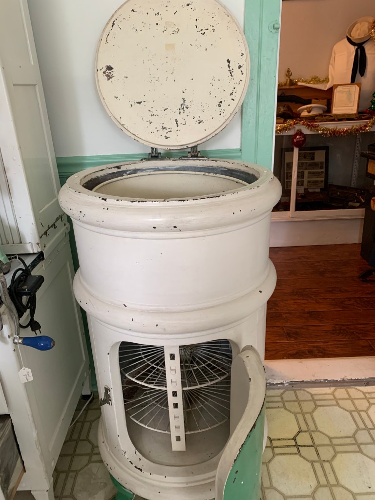 And have a look at the icebox – the original refrigerator. The block of ice would go in the top, after they’d spent time and effort chipping off the square edges. This would keep the food, stored on the lazy Susan-like shelves in the bottom, cool for as long as the ice lasted. Judging by the size, I’d venture to guess they didn’t plan on storing enough food for banquets. I wonder how dinner parties worked.