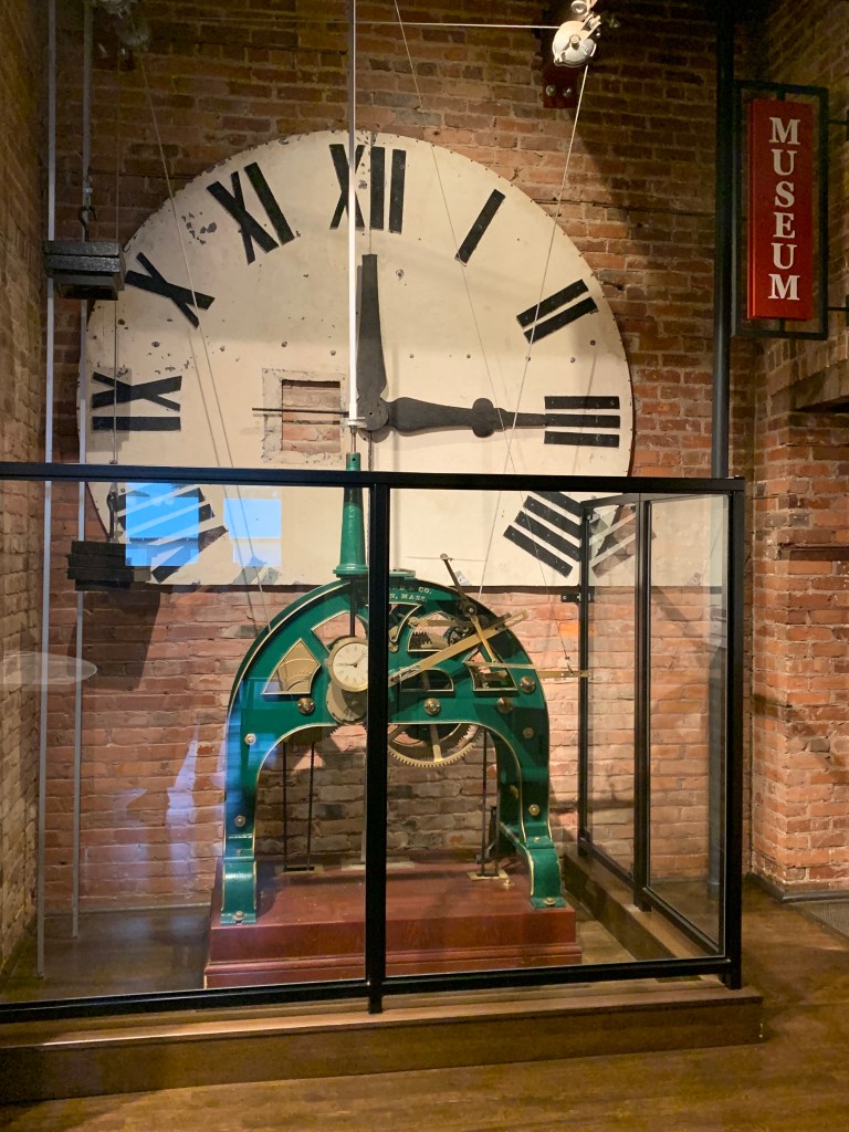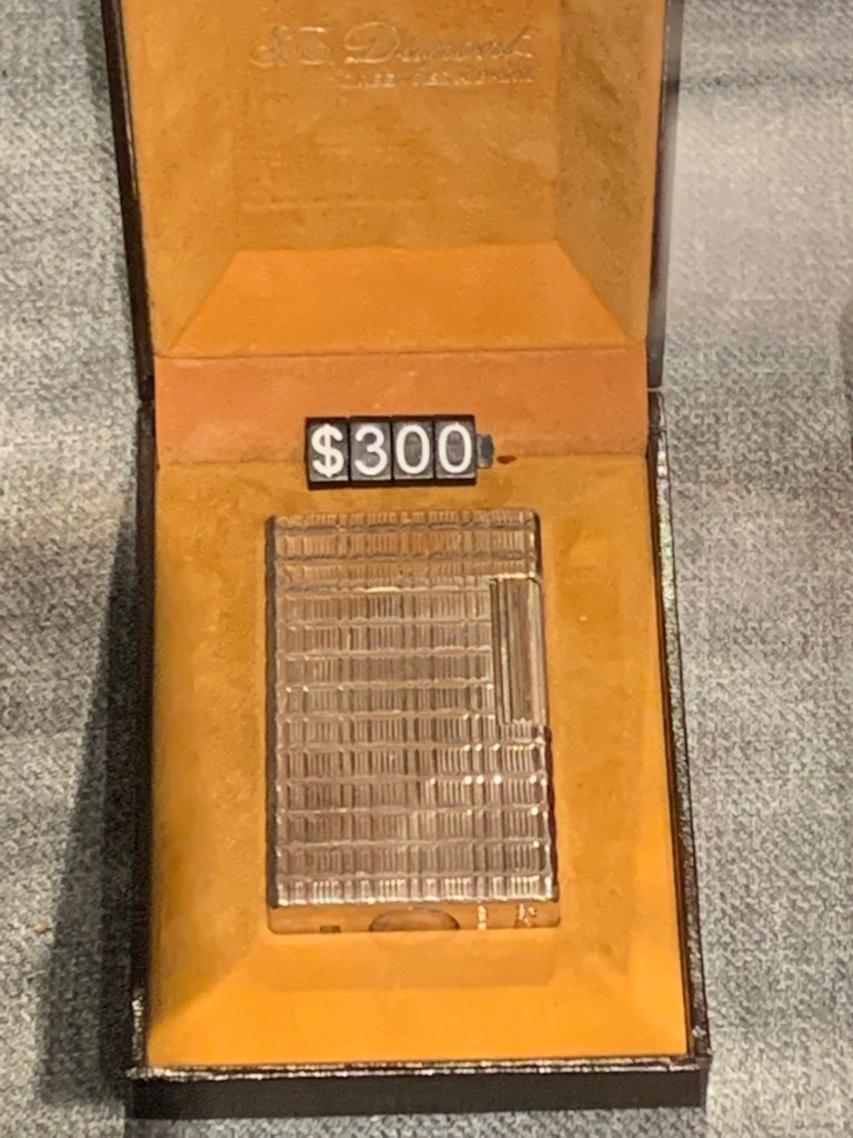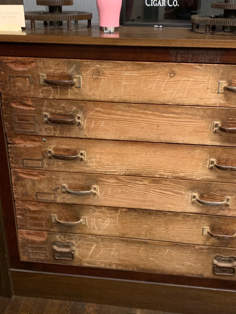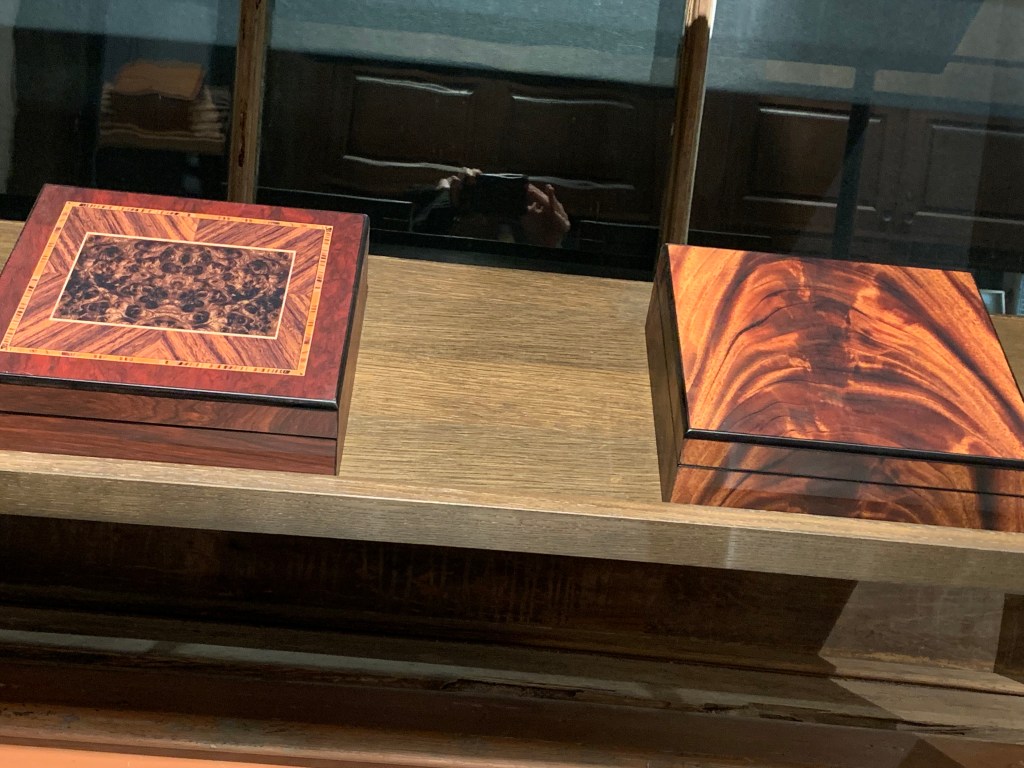 When I walked into the lobby of the building, the clock was the first thing I saw. It’s massive. But there were so many beautiful and interesting things to see while I waited. There were the stairs and the polished handrail, an old chest that originally stored cigar trays, a tobacco leaf mural against the back wall of the gift shop, cigar trays repurposed to make a vestibule for the elevator, an expensive lighter that reminded me of a silver one I managed to get an admirer to give to me when the dance troupe I was with was in Cairo, Egypt (but that’s a whole nother story), some gorgeous cigar boxes for sale, and on the museum side of the lobby, an account book of a tobacco auction in Paris around the 1960s.