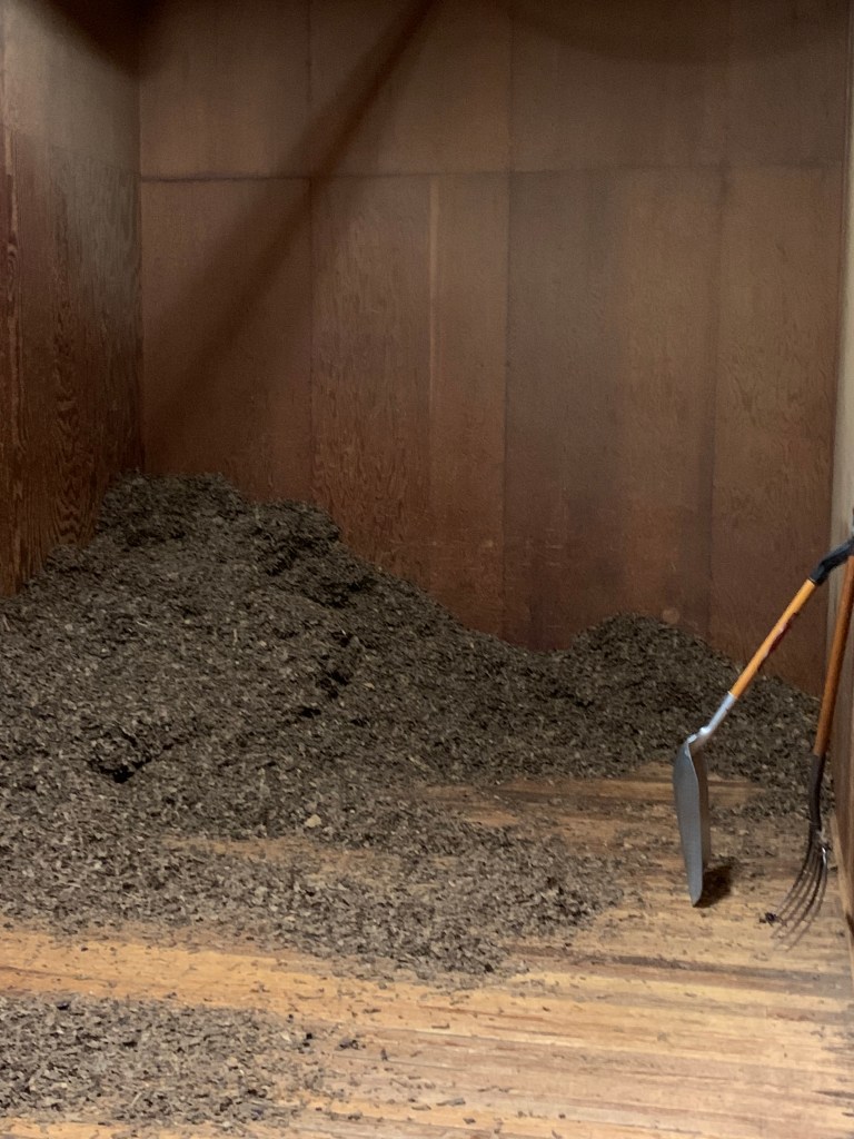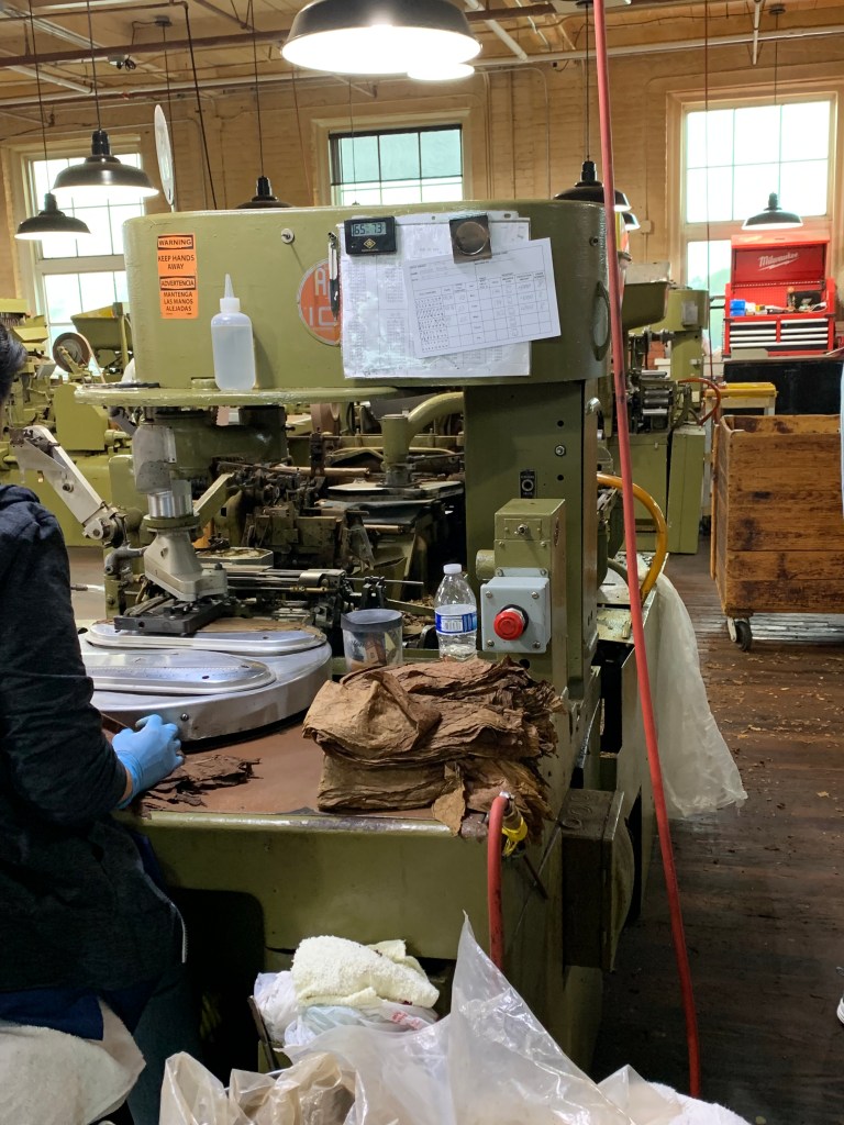 Now that the basement tour was complete, our guide, Holden, took us up several flights of stairs to the heart of the operation – the production floor. We first saw where the machine-made cigars are produced. These cigars use less expensive tobacco. The parts of the leaf that are trimmed away by the machine or discarded by the worker, go into a bin and end up being funneled into a room that looks a bit like a horse barn. They are then used as filler in the cigars. Nothing goes to waste.
