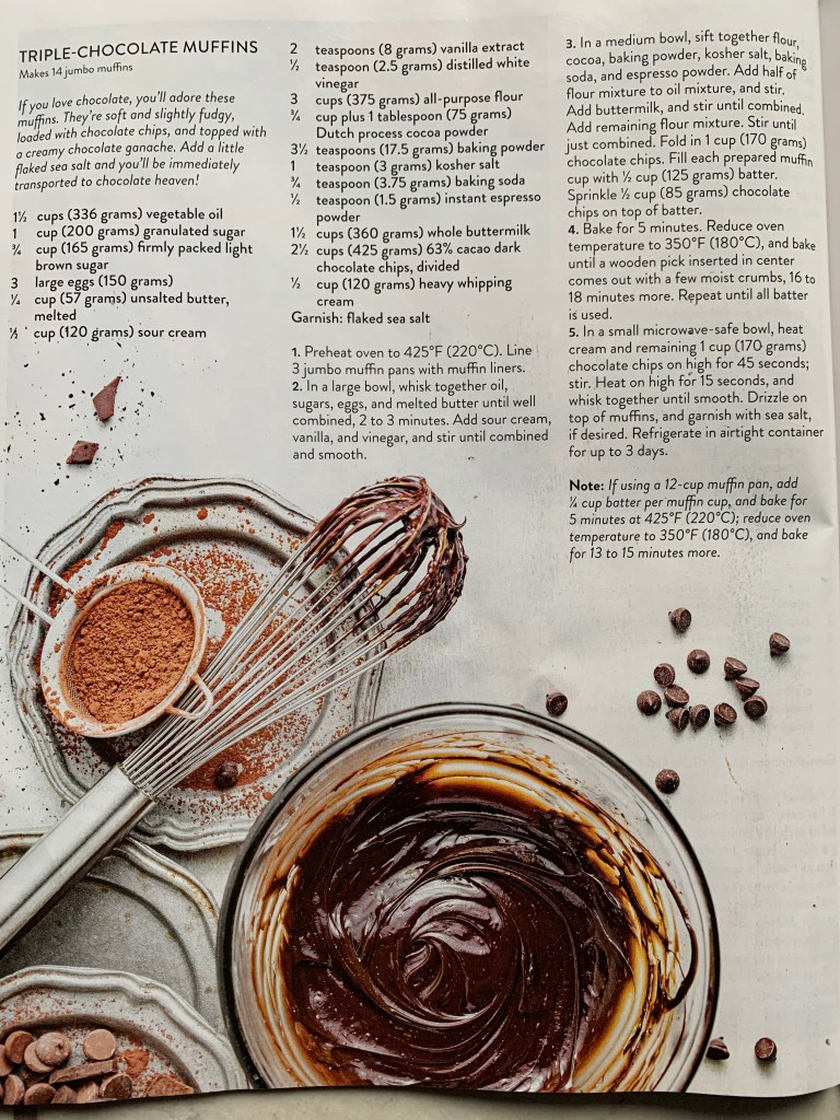 I discovered a magazine called Bake From Scratch. The first issue I received was chock full of sweet treats and the first recipe I pounced on was for chocolate cupcakes. They say we eat with our eyes and for sure I couldn’t pass up this scrumptious-looking confection once I saw it.