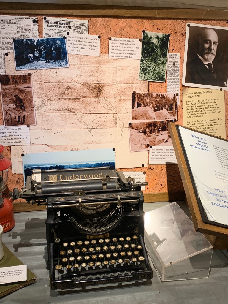 Named for Dr. Leslie W. Weedon, a physician known for his study of yellow fever, the land was given to him as a wedding present. Although he loved the natural beauty, and spent time fishing and bird watching, he was captivated by the Indian mounds and spent most of his time exploring them. Not the only one to do so, many explorers came and went and left artifacts like the old typewriter (below) and various journals and documents.