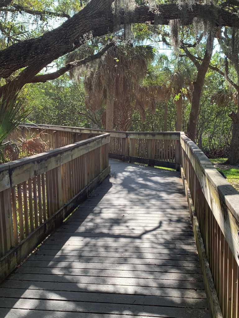 To my left, the path continued; to my right was a boardwalk. As I contemplated which way to go, a man came striding down the path. I asked him if I should worry about alligators. He responded that he walked that way all the time and he’d never seen an alligator. However, he said, there were lots of rattlesnakes, so I should walk in the center of the path.