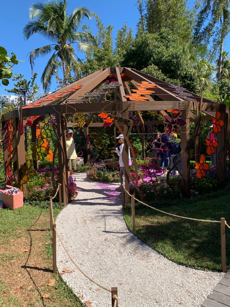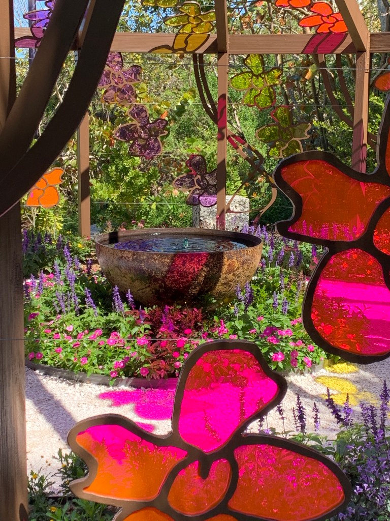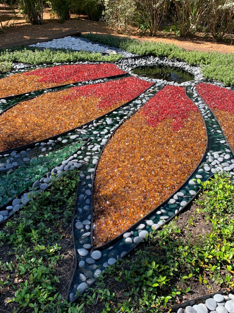 Every curve of the path takes you to another stunning scene: countless beds brimming with colorful flowers, a glass mosaic, and a tiffany-esque gazebo with a bubbling fountain.