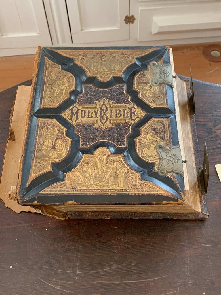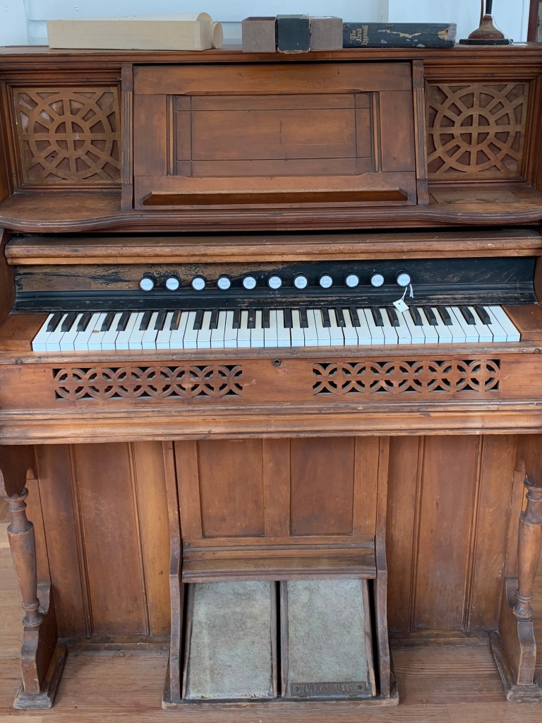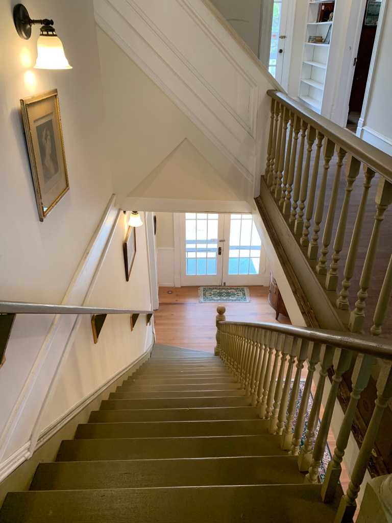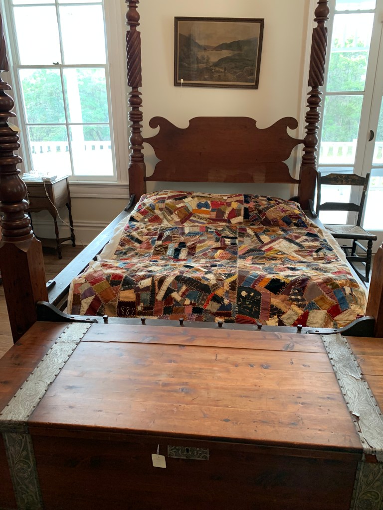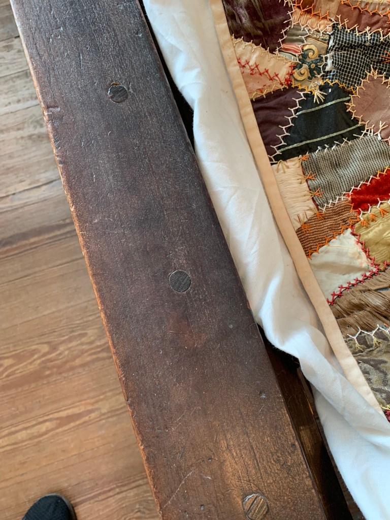 Since the interior is currently under restoration, there are rooms you can’t even enter because the floors are sagging and considered hazardous. I’m a little amazed the bedroom we walked through was considered safe because the floor clearly listed to one side (which is also evident in the slightly off-kilter photos of the bed). Even so, there were pieces I’m glad we were able to see up close – like the original pegs in the bed frame.