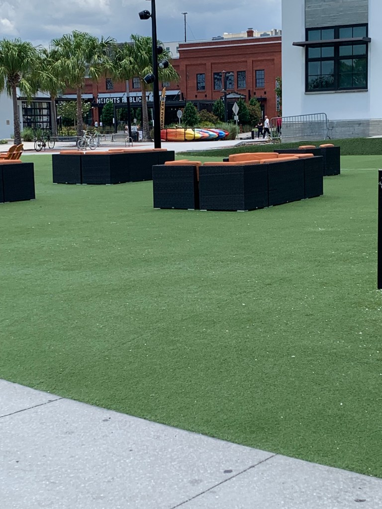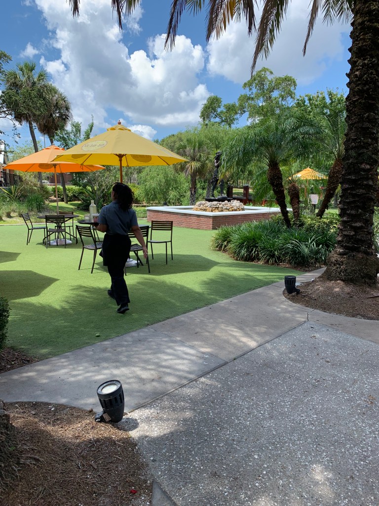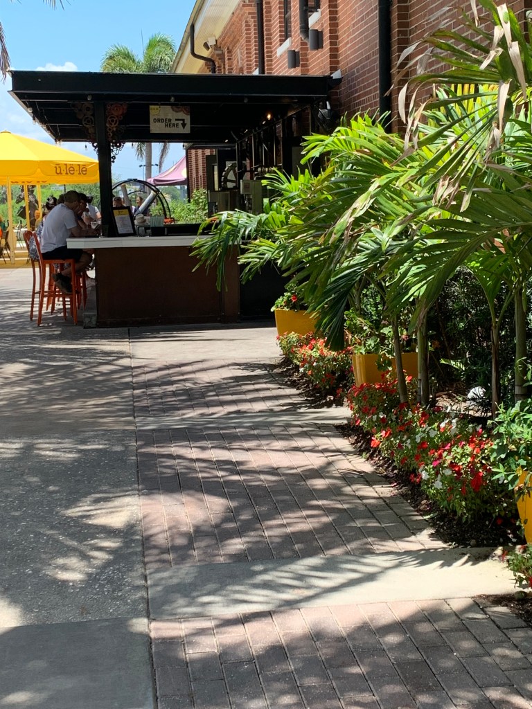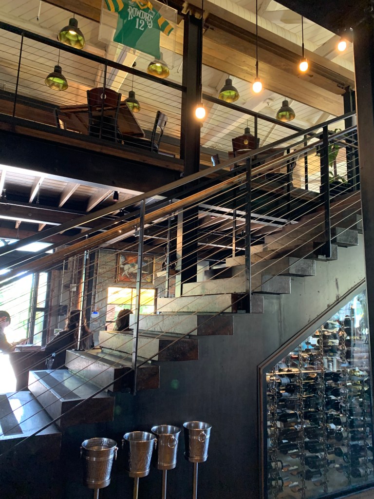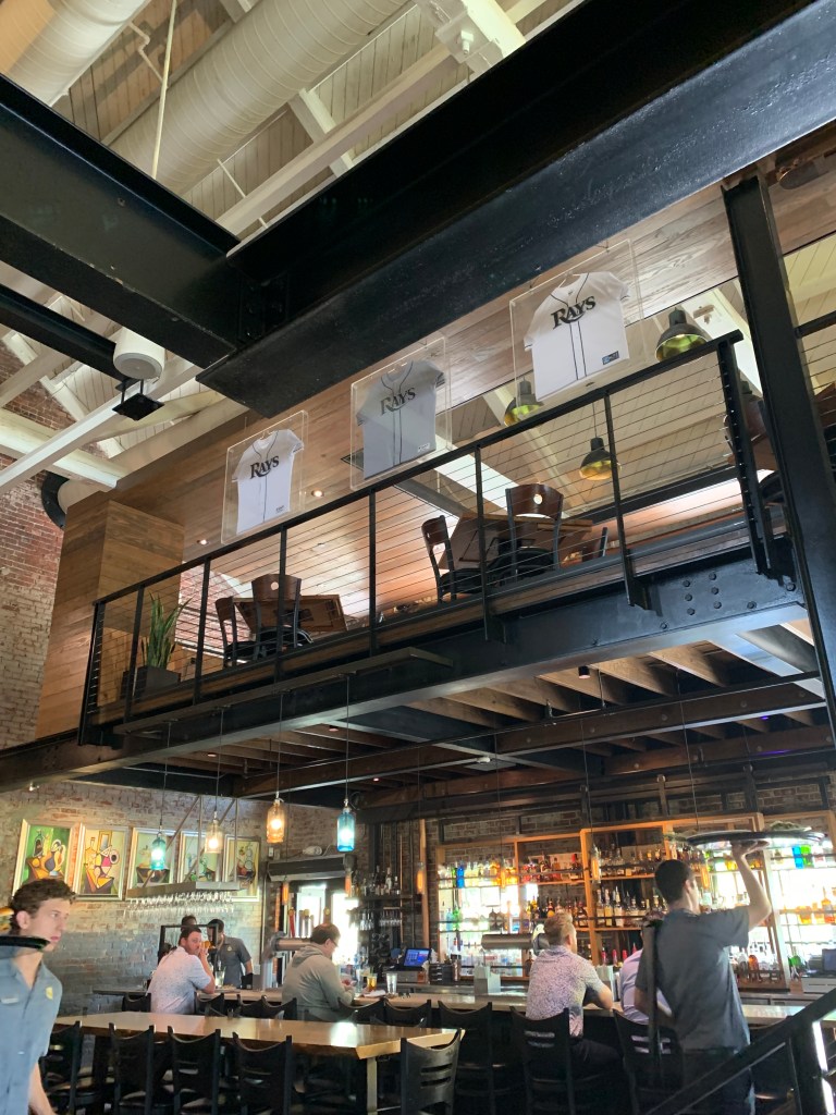 You can dine indoors or out. Inside has an industrial look with lots of wood accents. The outdoors has tons of green space, huge fans to keep you cool and a walk-up bar.