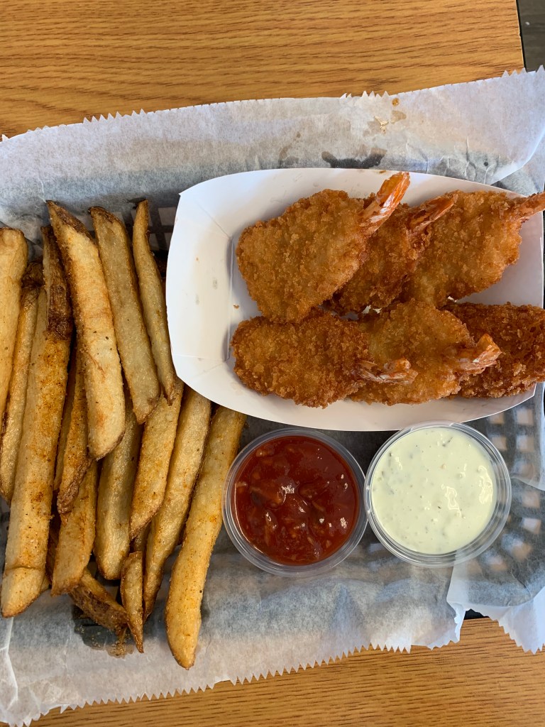 I then headed up to the boardwalk and checked out the restaurants and water tours. It was a pretty hot, muggy day so I decided I could do without any more sun. I passed on the water tours – I mean, can you really see this 70-year-old on a jet ski? – and opted for a nice, reasonably priced fried shrimp basket ($10) at the Boardwalk Grill. I really wanted the grouper sandwich but the price was $18. I figured I could have a three-course meal for that (OK, three-course meal might be a stretch but you get the idea). I must say, the shrimp were delicious but, then again, I’m eating fresh seafood in a fishing village. They better be, right?
