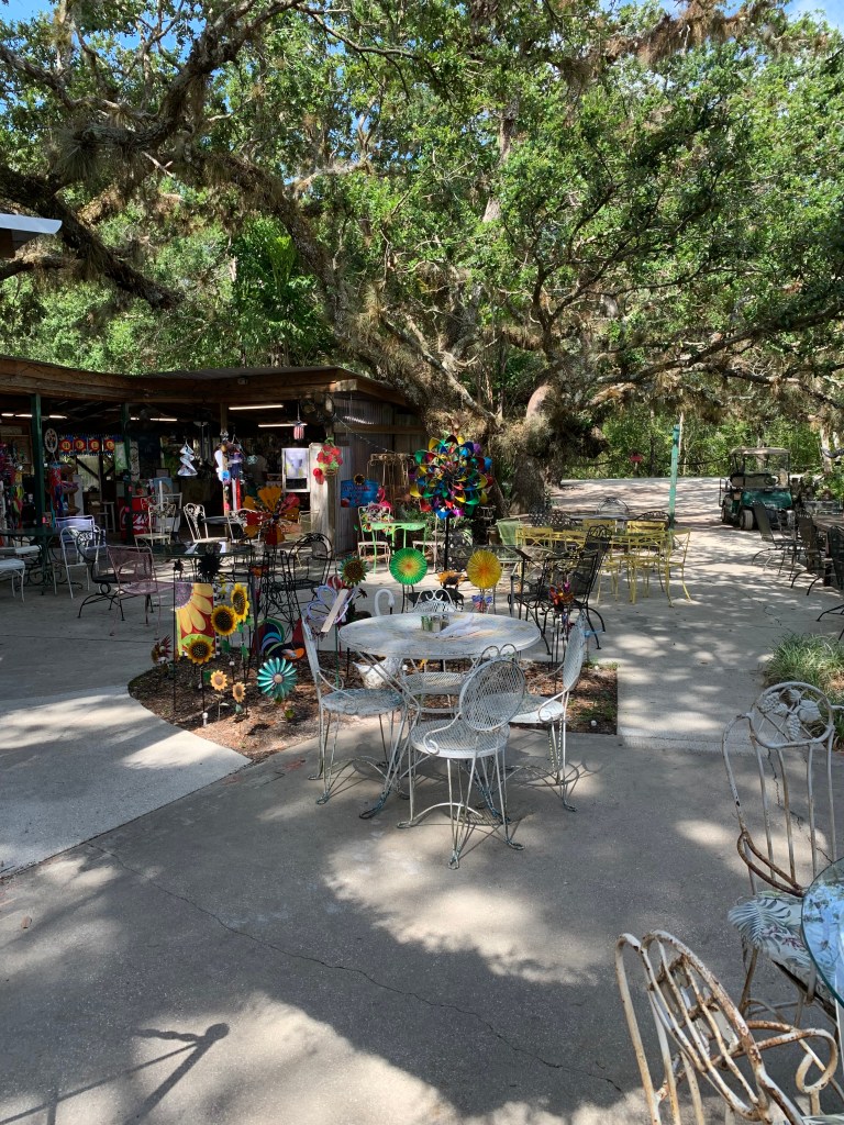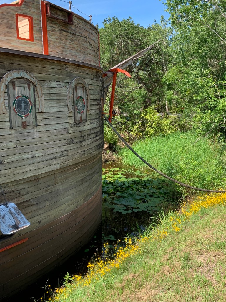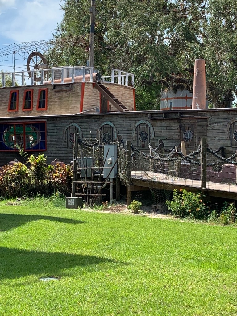 I wouldn’t have thought twice about the pilings except that I noticed the floor seemed to be moving slightly. Before having lunch, I’d asked if I could explore the path behind the boat. I’d been told that would not be possible because the bridge spanning the moat area had been pulled up and moved several feet during Hurrican Ian. Now I wondered if the pilings had also been damaged. I decided not to linger over coffee.