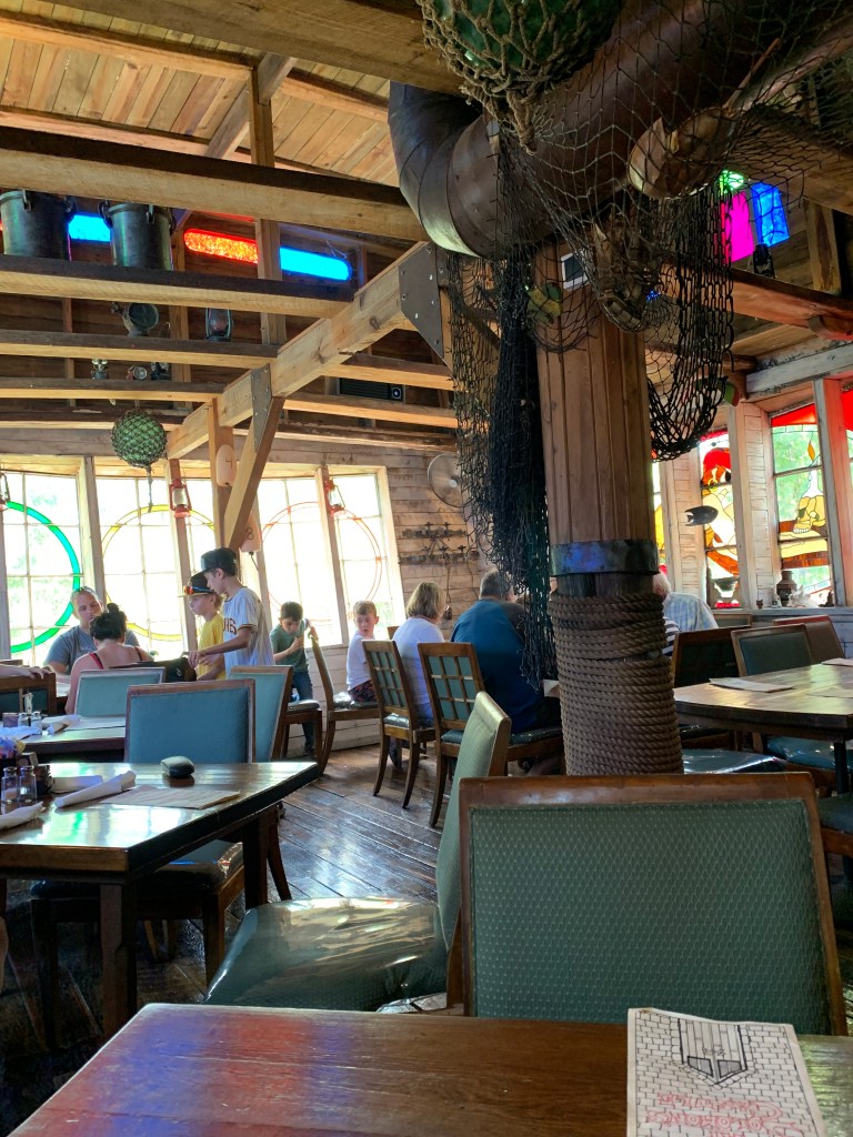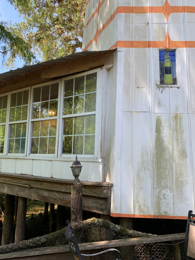 The guide had indicated that Solomon wanted to build a restaurant in the swampy area and call it the boat in the moat. She said he built it himself, dropping in all the pilings on his own. It’s attached to a separate seating area and a lighthouse.