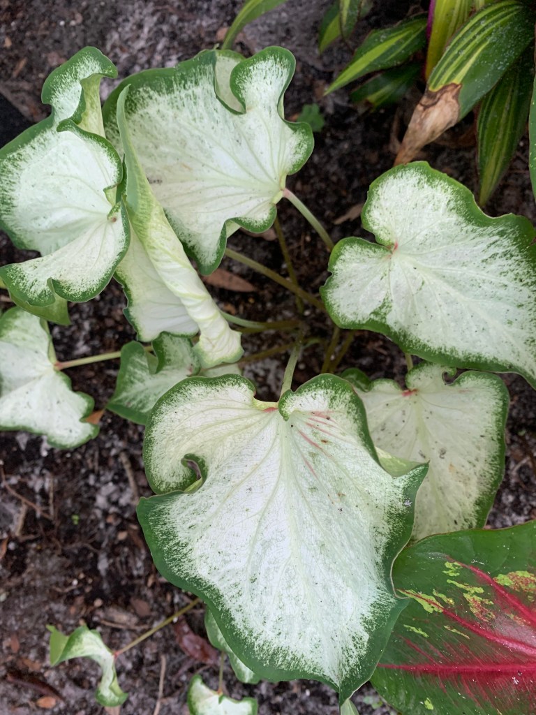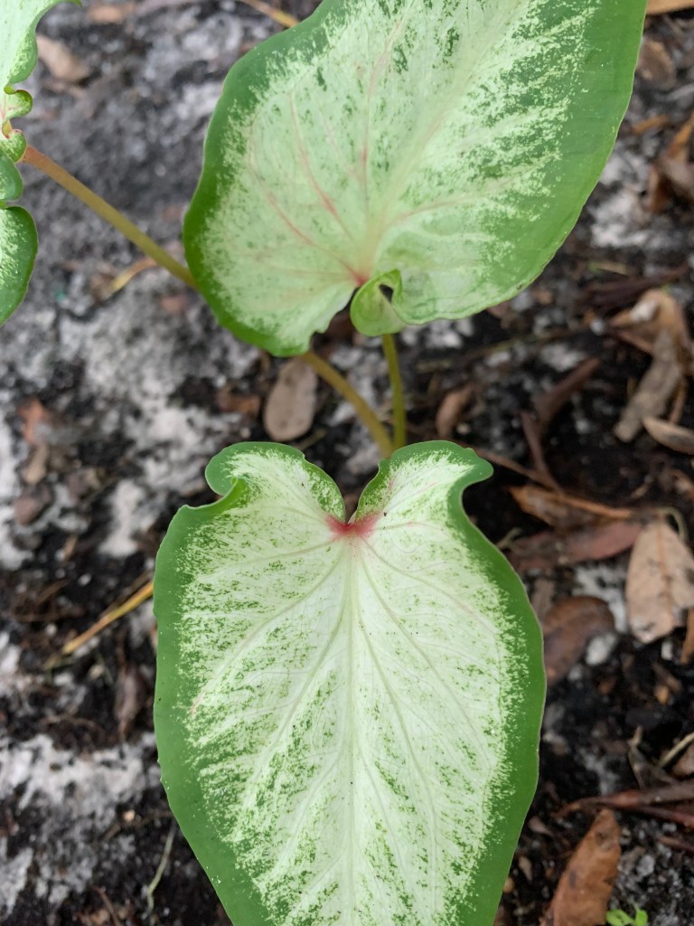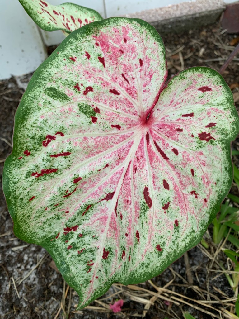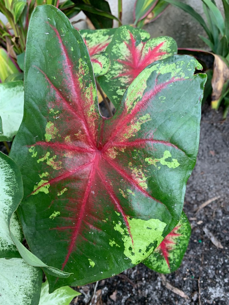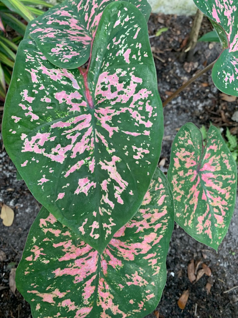 Then one day, it occurred to me there was a caladium in front of the house, left by the previous owners, that continued to thrive in spite of my lack of care. Already well established, it didn’t have those juicy little baby roots the squirrels seemed to prefer. So what if I planted caladiums in the backyard? I went online to see if a variety of caladiums existed beyond the red ones I typically saw. I discovered Blue Buddha Farm. A small family-owned enterprise, they sell gorgeous, colorful, variegated caladiums. They don’t charge a fortune (great for someone like me who manages to kill everything) and – added bonus – they even send you two of each. It took almost two months for my plants to make an entrance above ground, but then they took off. And I love them.
