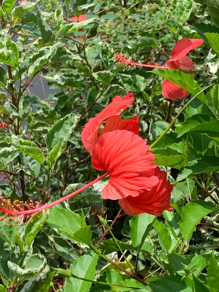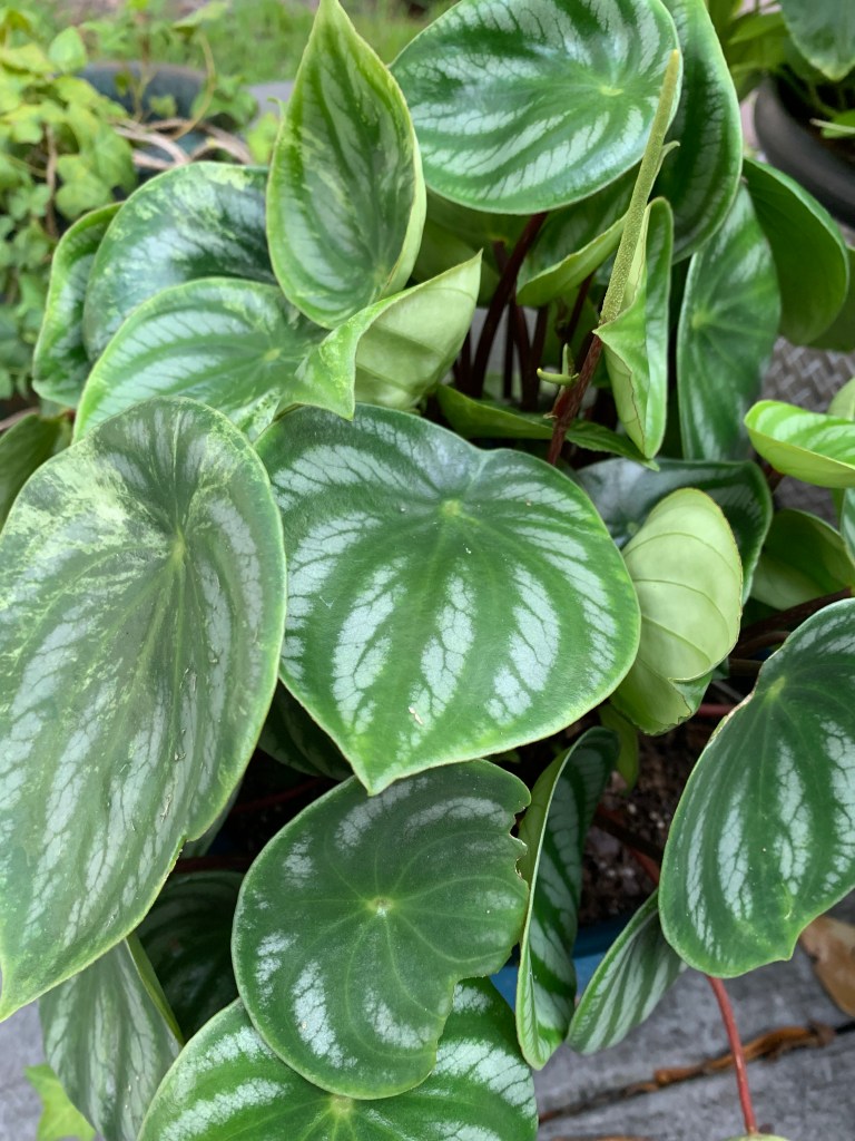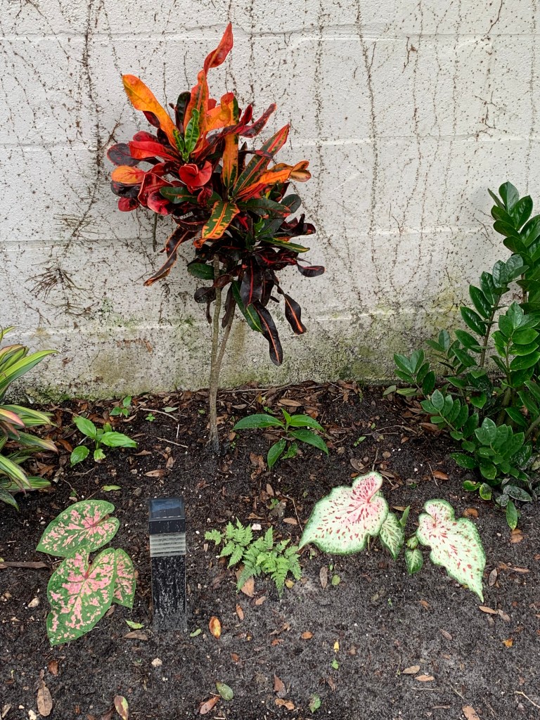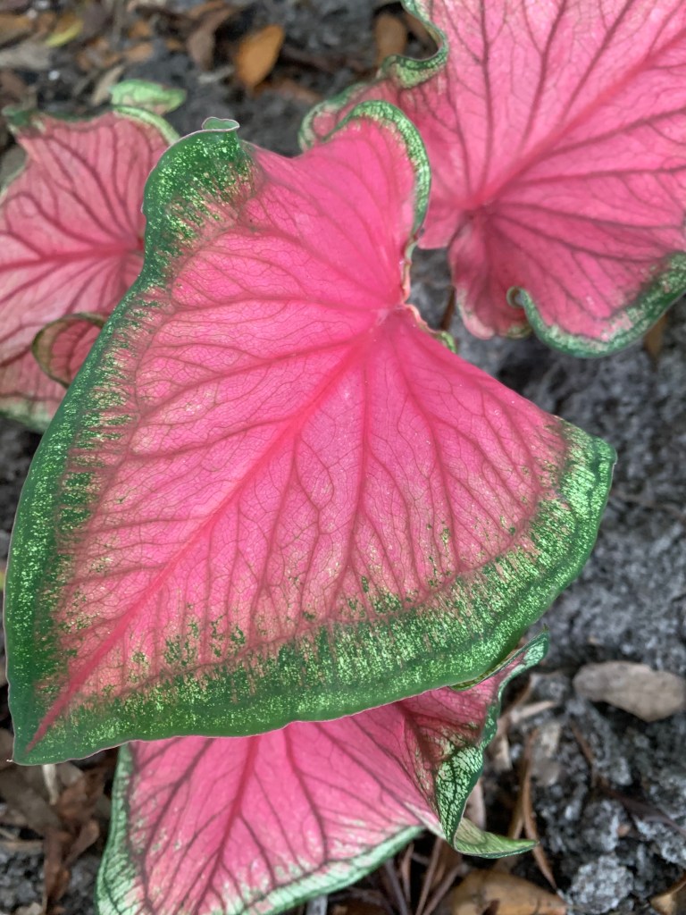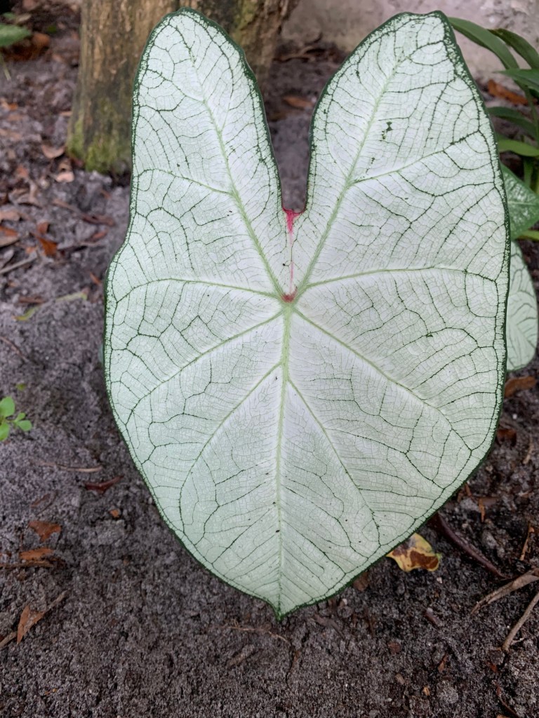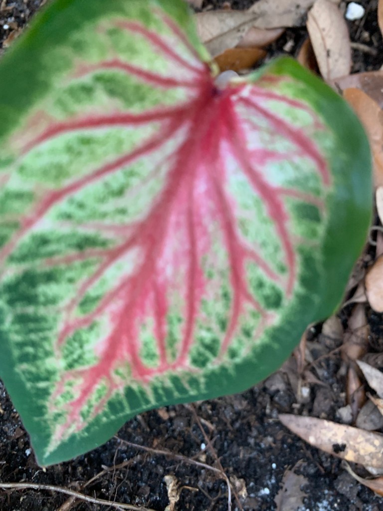 Then one day, it occurred to me there was a caladium in front of the house, left by the previous owners, that continued to thrive in spite of my lack of care. Already well established, it didn’t have those juicy little baby roots the squirrels seemed to prefer. So what if I planted caladiums in the backyard? I went online to see if a variety of caladiums existed beyond the red ones I typically saw. I discovered Blue Buddha Farm. A small family-owned enterprise, they sell gorgeous, colorful, variegated caladiums. They don’t charge a fortune (great for someone like me who manages to kill everything) and – added bonus – they even send you two of each. It took almost two months for my plants to make an entrance above ground, but then they took off. And I love them.