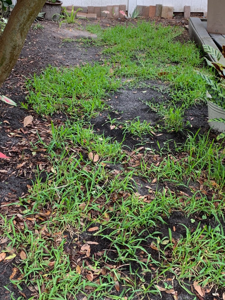 I was so discouraged that I gave up, turned a blind eye to the splotches, and focused on the empty beds along the fence. But what I really hoped was that maybe the bits that survived would somehow spread out on their own and cover all the bald spots in the dirt. I swear that’s exactly what’s happening.