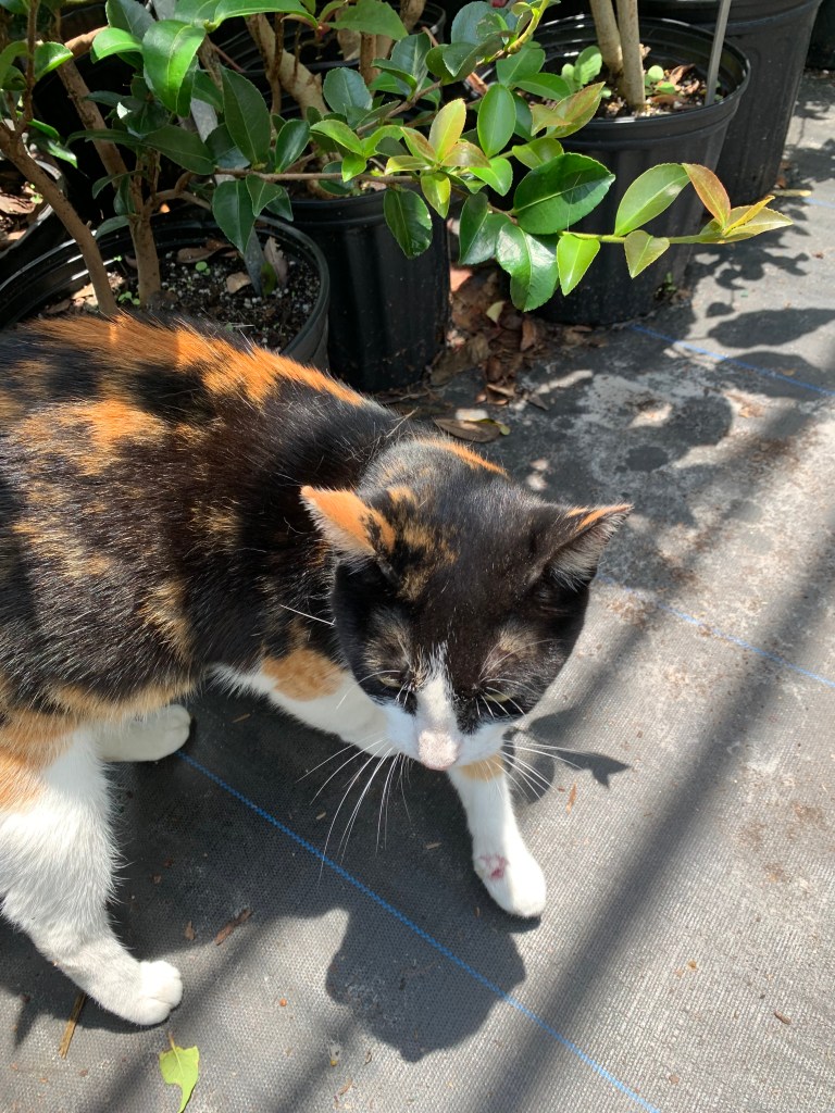 Since I have a backyard with dappled sunlight, I love it that Duncheon’s has a huge selection of shade-loving plants to help me figure out a game plan. Yes, they have all the usual things you’d find elsewhere, but they also have a variety of color, texture and shape that lends a bit of extra interest. I’m not one for a garden full of the same plants you see in every yard on the block, so I like the unusual choices. And I must admit, I kind of enjoy browsing with the company of Basil, the rescue cat (see below). Any business that nurtures both plants and animals is ok by me.