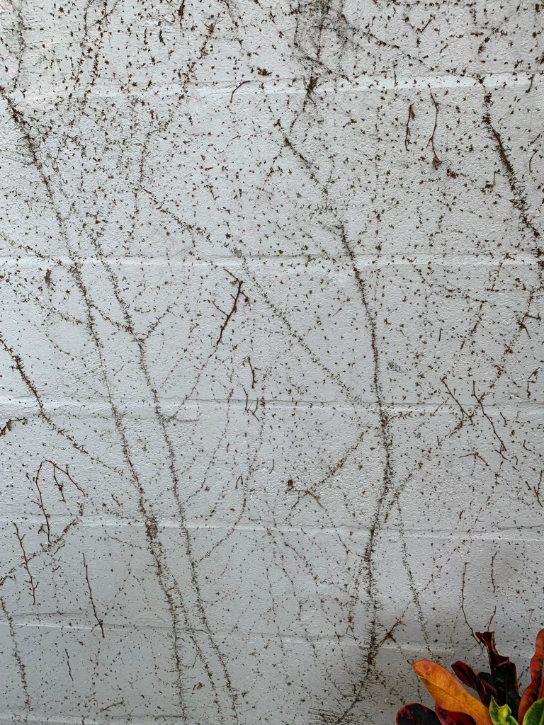 I was suddenly on a roll. So I decided to tackle the ivy taking over the back wall. I hated it but had been afraid to yank it down. I don’t really know why. What I hoped was that anything I planted would then stand out against the white wall instead of blending into the dark, olive-green ivy. The only problem with that plan was that I couldn’t find a way to get rid of the vine’s suckers and, if you look closely, I’m pretty sure they form a road map from Maine to California.