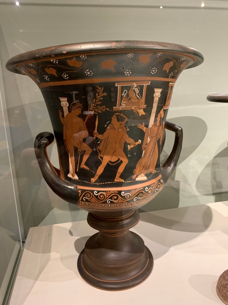I love ancient artifacts but since I’m not an artist and don’t know what it took to cast or mold or sculpt them, I find myself, instead, wondering what life was like back then and how the piece came to be in existence in the first place. Were the recipients pleased or did they bitch behind the artist’s back because a vessel didn’t hold enough wine? Did they think the handles were too flimsy? Did they rave about it as the epitome of craftsmanship? Did they order a set of six amphorae for an upcoming party and then plan to send invitations several months later because that’s how long it would take the artist to complete them?