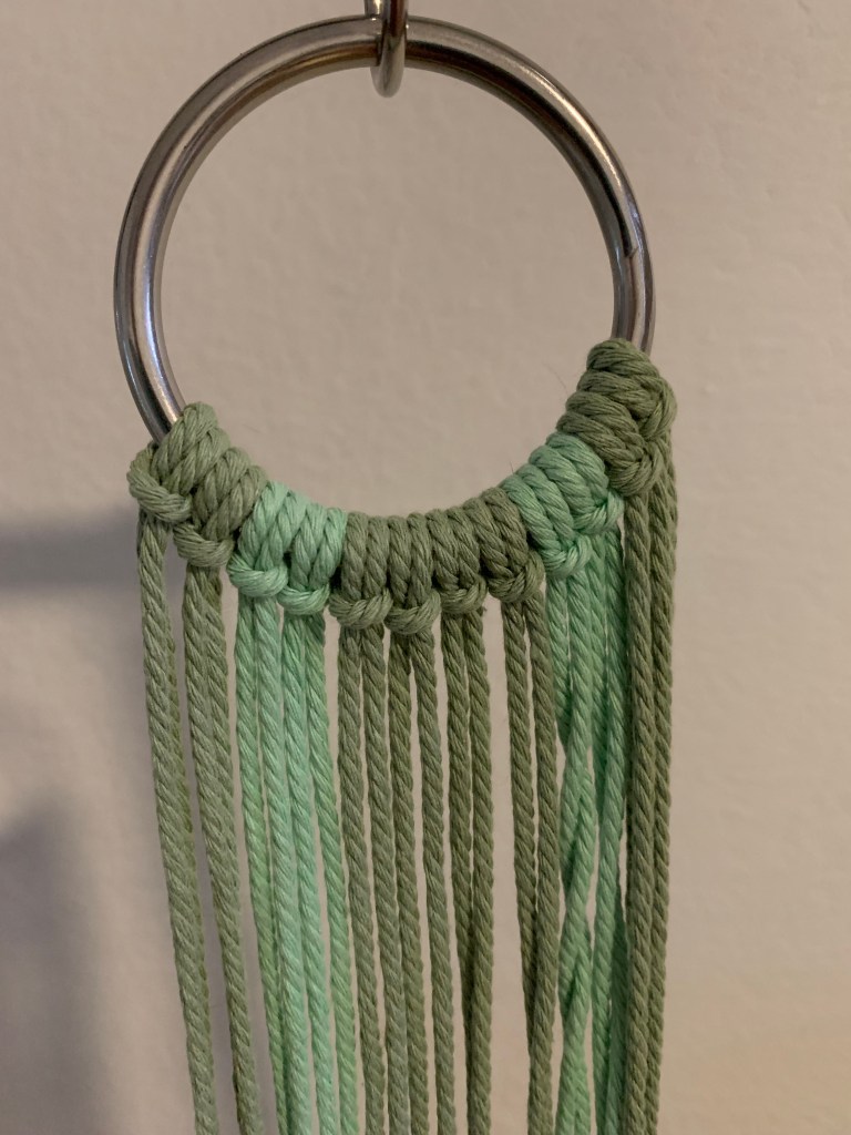 I tackled the issues of how much yarn to use, how big the ring needed to be, what size cord to order and how to tighten knots when the whole project was free-floating in my lap. And, of course, there are my two cats who love dangling strings.