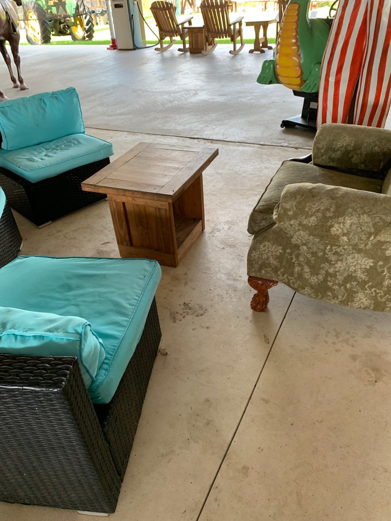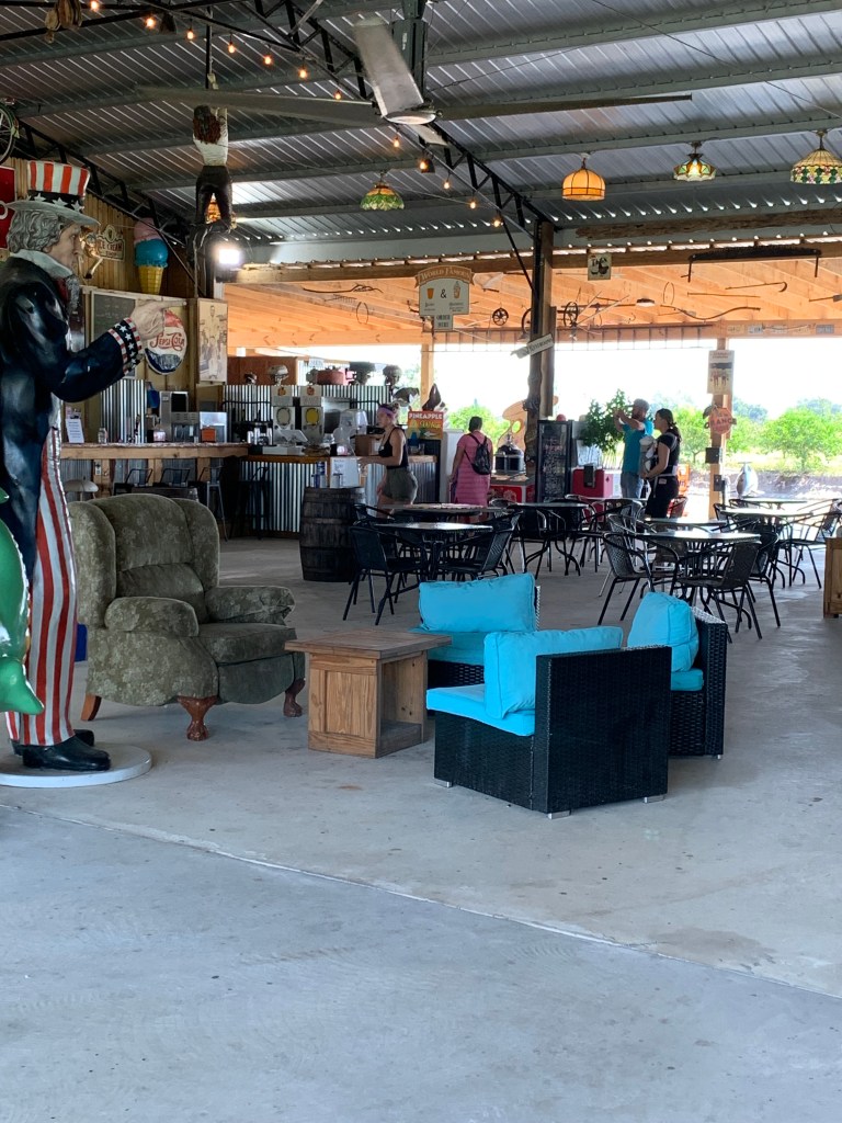 I ventured up the sidewalk past the farm animals and arrived at a mammoth open barn. It sported dilapidated furniture and kitschy decor hanging from the ceiling and randomly placed throughout the space (lots of trucks as you can imagine).