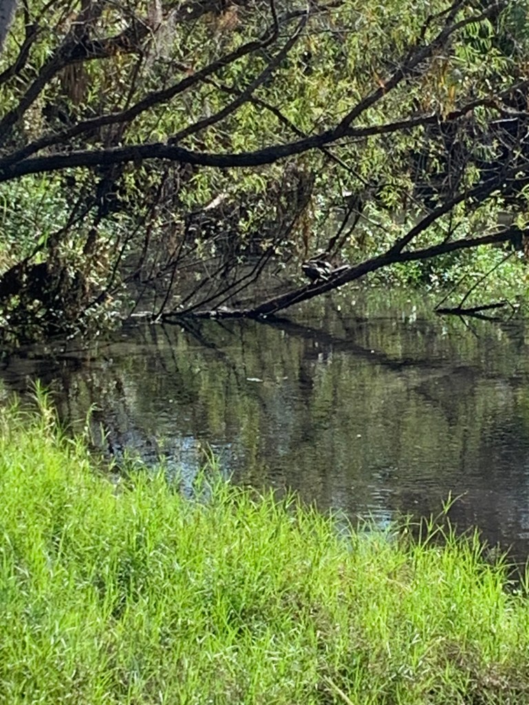 Ah ha! A giant bird on a branch in the middle of the stream. It seemed too far away to look majestic so I took a few steps closer to zoom in. It was then I spied an enormous alligator on the grass. I took a quick snap of him and scurried back to the safety of the car. I very briefly considered inching a little closer but my better judgment prevailed. It was only a short while ago that an alligator was seen strolling down a Tampa street with a human torso in its mouth. That, coupled with the fact that alligators can run up to 35 miles per hour on land, made me give the idea of inching closer a second thought.