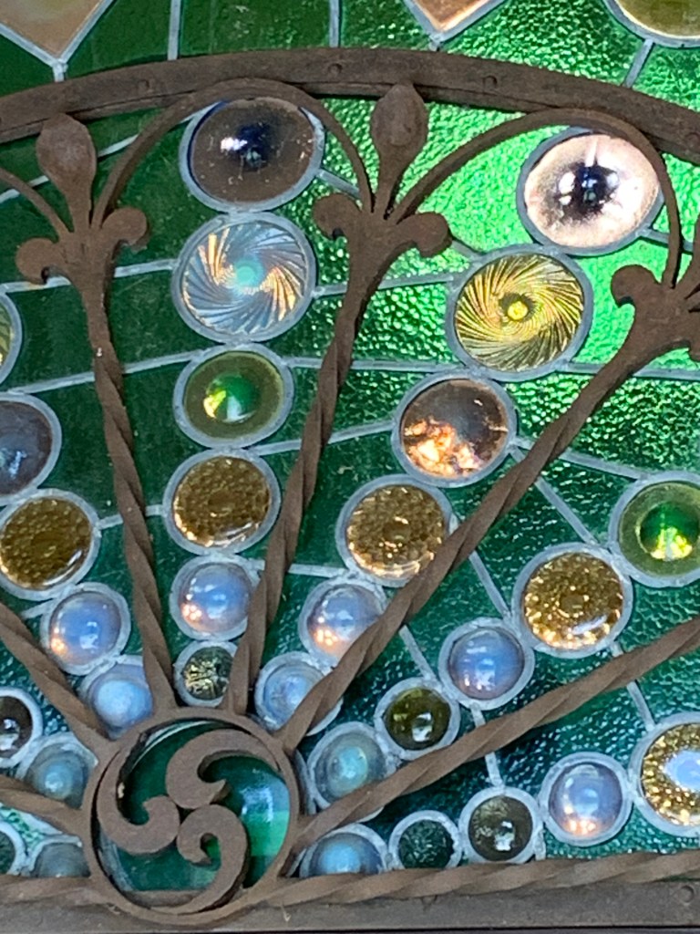 The front door, 2 stories high, features stained glass resembling a peacock tail. Outlining the door are two panels with diamond-patterned stained glass. They are original, as is the light fixture.