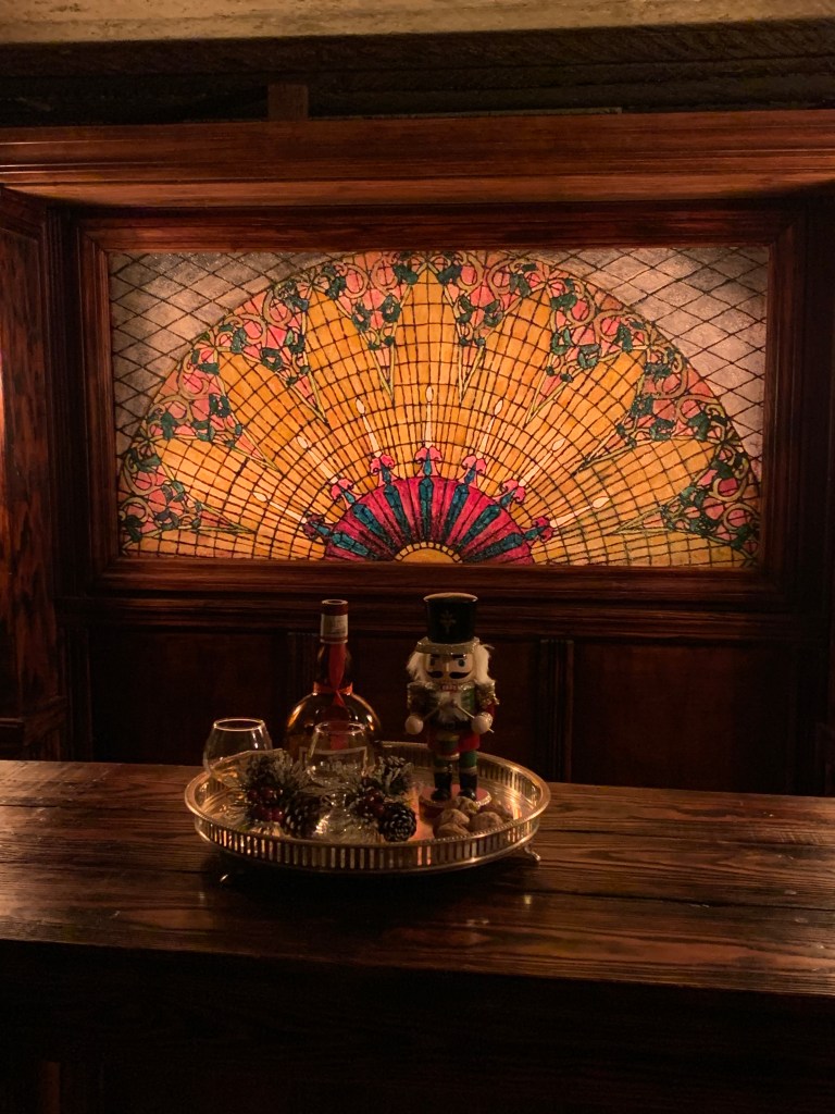 Back to the entryway and proceeding up the center staircase, you reach a cozy library – but this one is special. There is a hidden spring on one of the shelves that trips a secret door right outside the room. It leads down to a basement speakeasy with beautiful glasswork behind the bar and some interesting 1920s light fixtures.