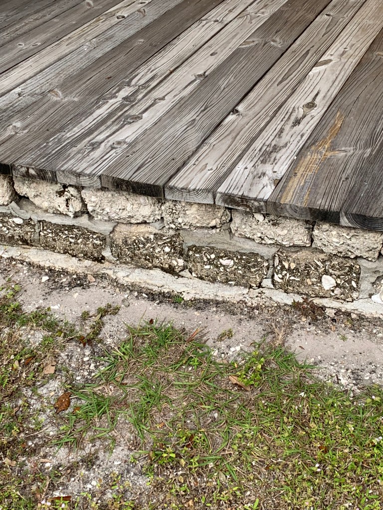 Although the wood on the porch is not original, the “tabby” underneath it is. Tabby is a type of concrete made when oyster shells are burned to create lye and then mixed with water, sand and ash. It’s far less sturdy than concrete and deteriorates over time.