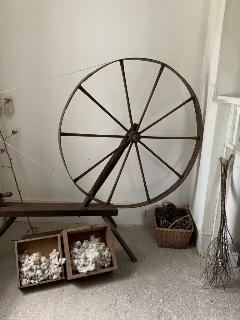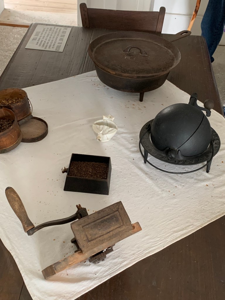 Although none of the furniture in the house is original, it is all from the same time period. The artifacts manage to tell a story of life during the Civil War. On the dining room table, placed upper right of the plate, is a small crystal container. It would’ve been filled with salt so Gamble’s visitors could liberally sprinkle it on their meals. There’s a loom for weaving cotton garments; a clothes press that looks like it would require several people to lift (so imagine spending hours ironing clothes each day); a coffee grinder; pots and pans by the kitchen fireplace; and a mattress paddle used to coax the lumpy mattress back into shape before the owner retired for the night.