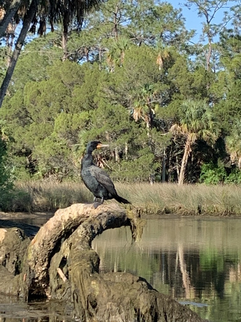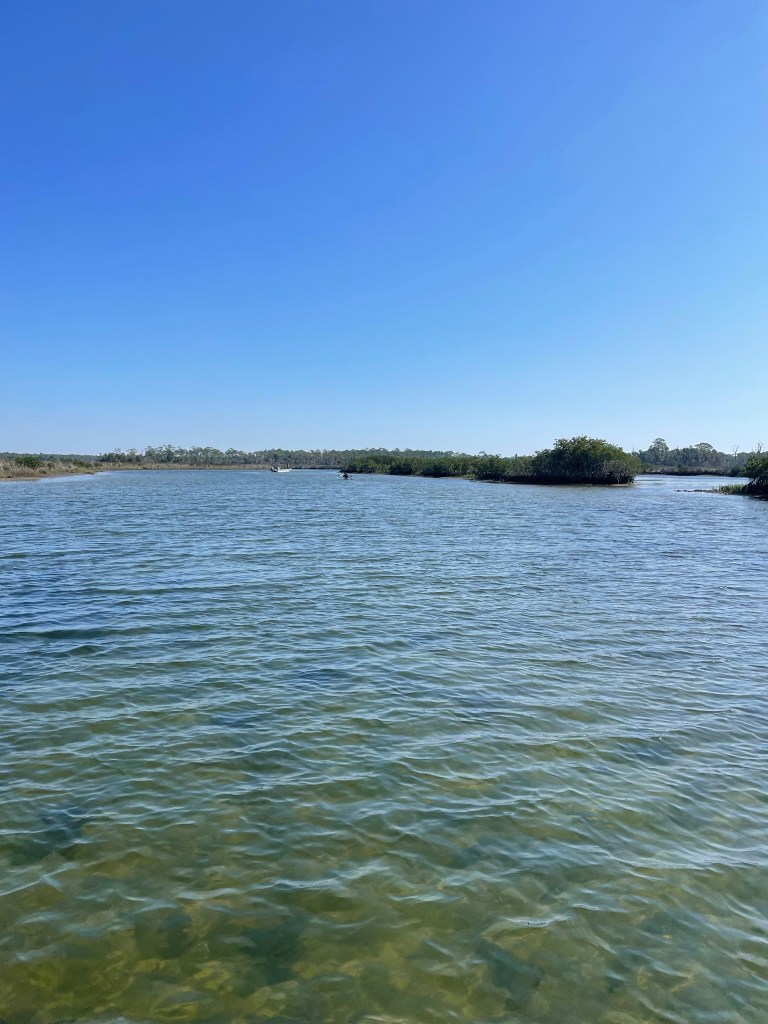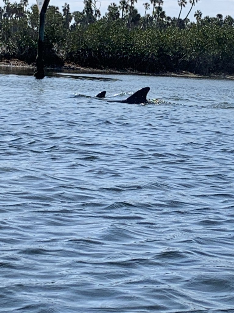 We continued on, hoping to see the bald eagles he’d told us about (we did) and possibly dolphins (we did). At this point, we’d been paddling for over an hour. I was beginning to feel my shoulders and upper arms and knew I was going to pay for this later. This was the moment the guide chose to say, “Save up your energy. We’ll be returning against the tide.” I felt a little panicky. Although we started out mid-morning, I had visions of making it back around dusk, long after everyone else had left.