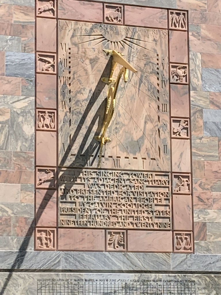 The tower’s brass door and iron gates were created by premier metalworker, Samuel Yellin. The tiles on the top third of the tower were designed by J.H. Dulles Allen and are meant to detail a balance between “nature, species and gender.” The sundial indicates the time by the shadow cast on the face. The hours are the 12 zodiac signs. The entire structure is an art deco and neo-Gothic theme. It’s a steel frame encased in coquina stone from St. Augustine, Florida. If you’re like me and don’t have a clue what coquina stone is, I looked it up. It’s a rare form of limestone made up of shell fragments from ancient mollusks and marine invertebrates.