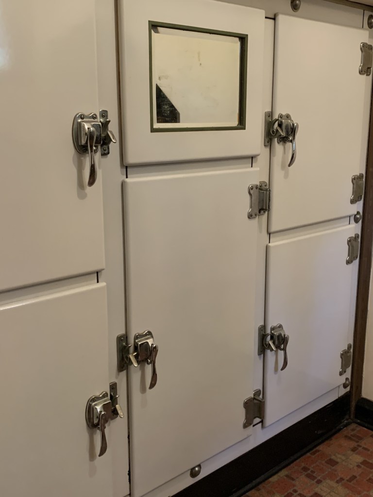 The front entrance and foyer doors are carved cypress wood. They offer a view of the pantry and when you venture into the kitchen space, there is an original built-in General Electric refrigerator.