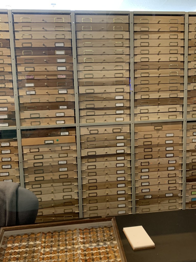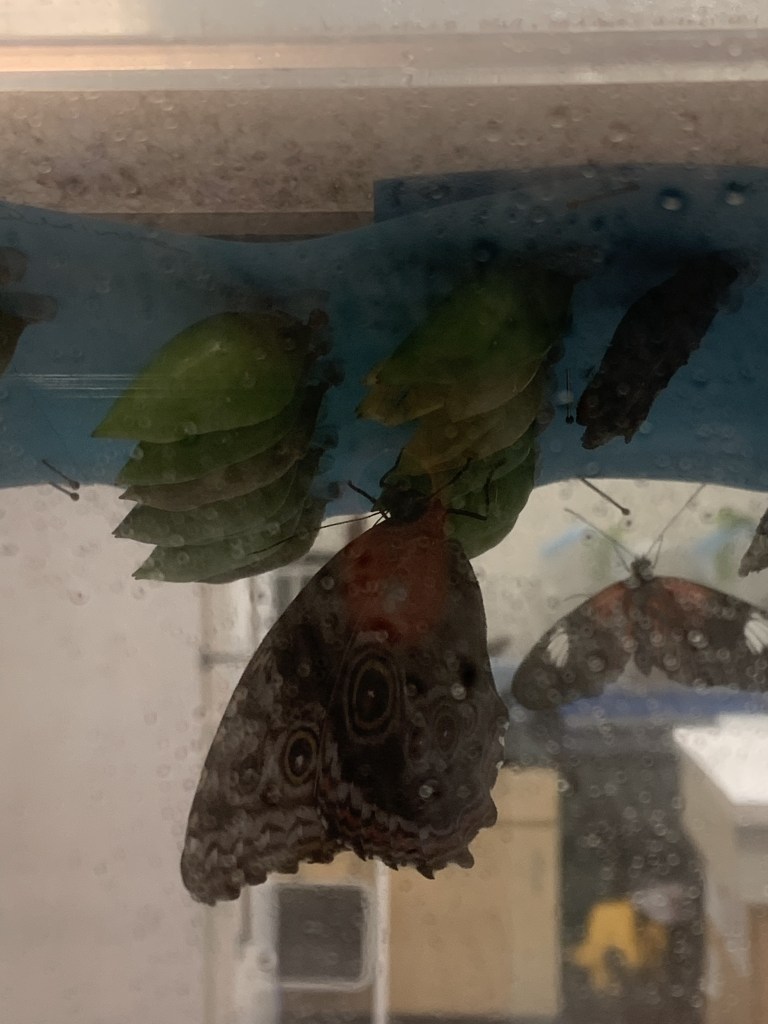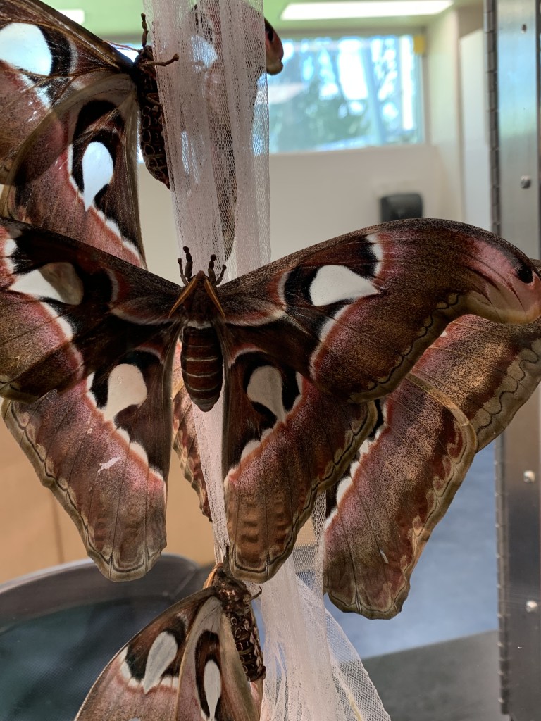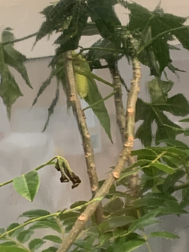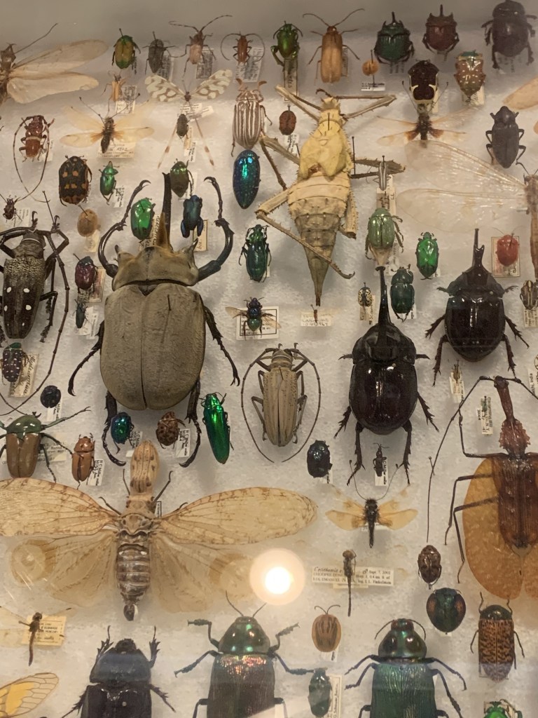 If I hadn’t been thoroughly exhausted by now, I might’ve spent more time with the exhibits. But I rushed through, photographing a few things along the way. There was the “rearing lab” where you could see the cocoons and some of the butterflies hatching; a room with rows and rows of catalogued specimens (over 5 million); a lab (who knows what goes on there?); a display of beetles that, if I were to run into any of them, would send me screaming; and a fun “where’s Waldo?” camouflaged katydid on a tree limb.